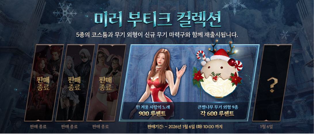 - 한 겨울 사랑의 노래 코스튬 및 큰별나무 무기 외형 판매가 시작됩니다.