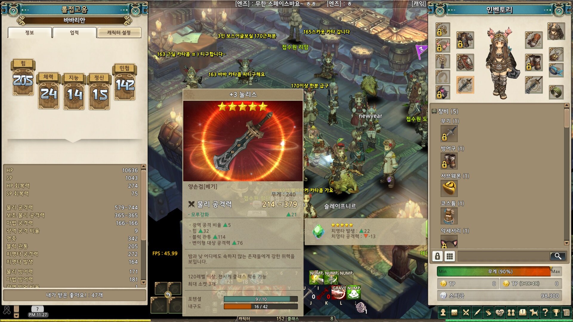 첫짤이 눌리스(3강)를 착용한 능력치입니다 579~744의 물공이 뜹니다.