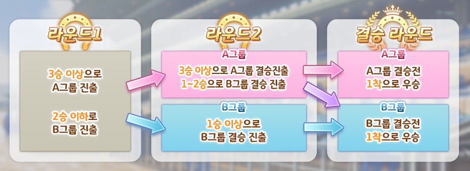 - 라운드와 그룹에 따라 한 엔트리에서의 레이스 수와 다음 라운드로의 진출 조건 등이 달라집니다.
