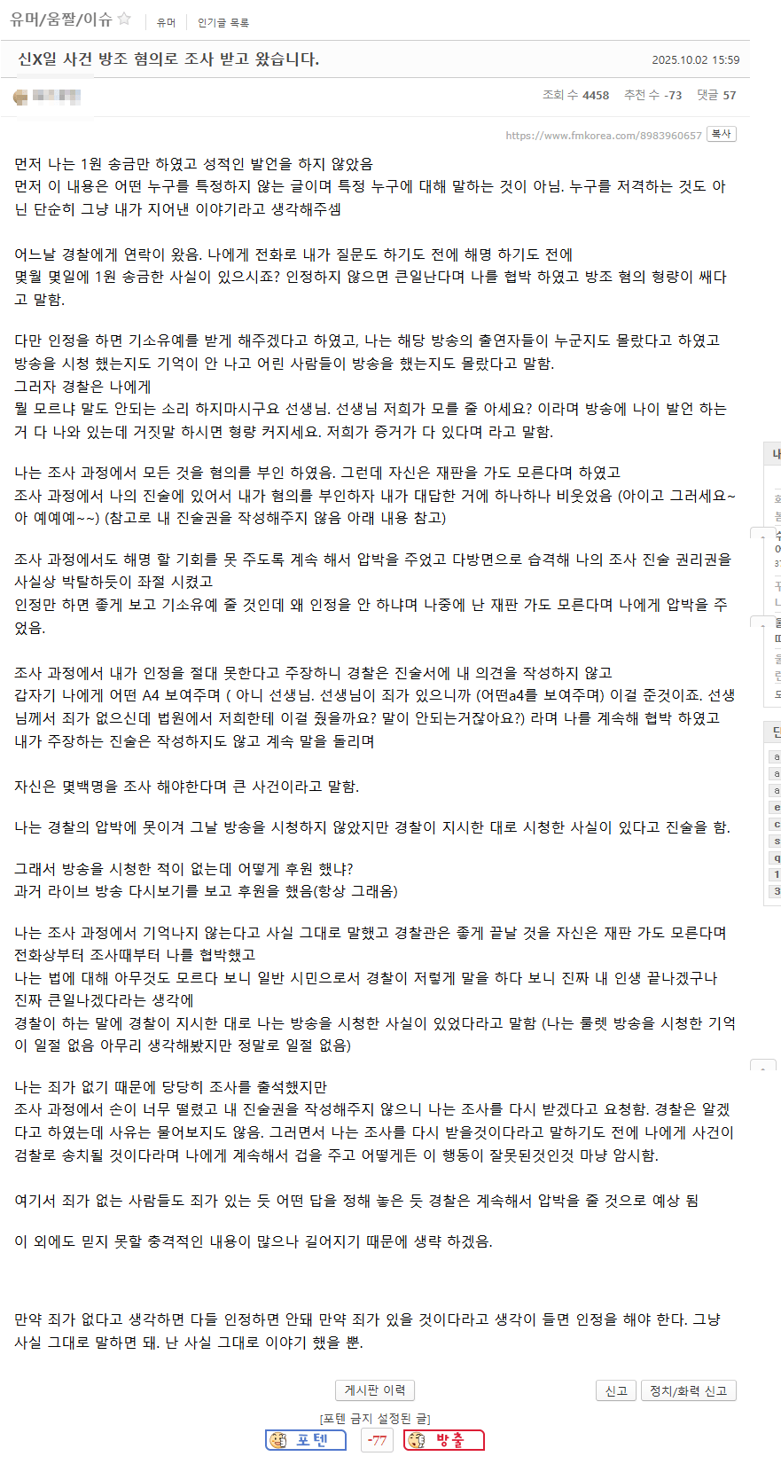 신태일 미성년자 성착취 방송 1원 후원하고 조사받았다는 사람