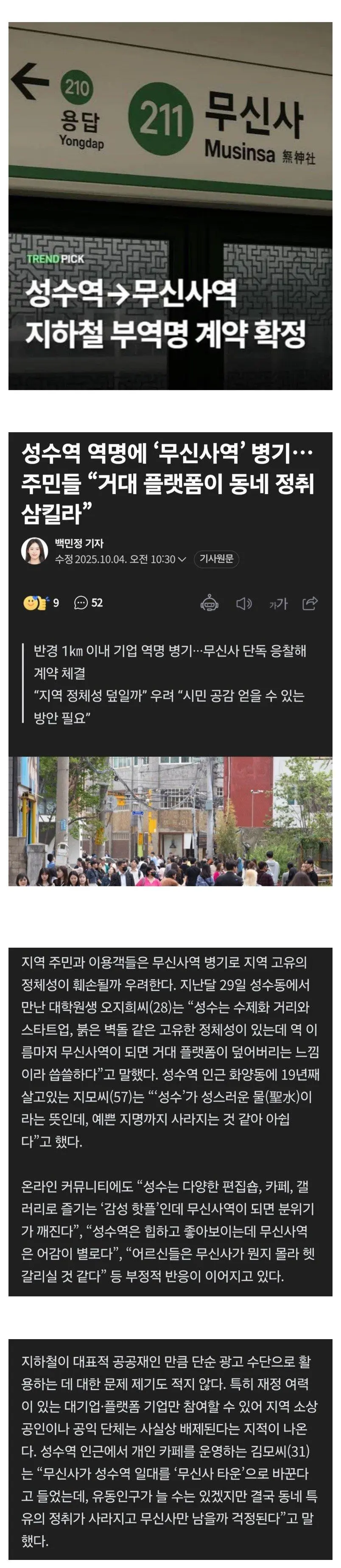 ‘무신사‘지하철역의 등장, 지역 주민들 우려
