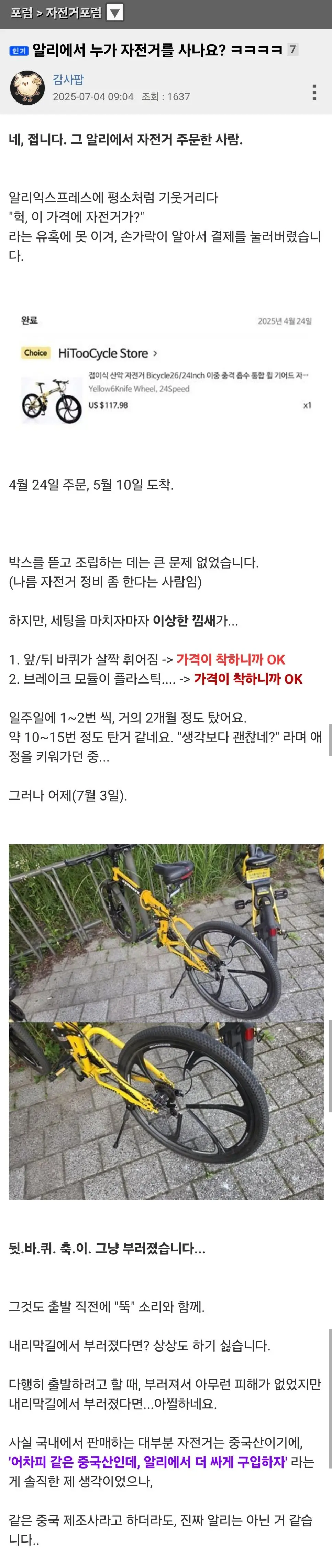 알리에서 자전거 산 뽐뿌인