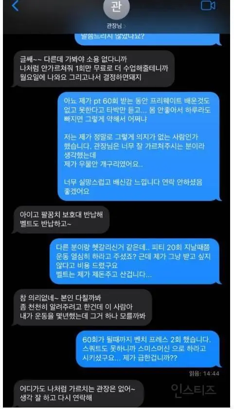 헬스장 PT 60회 받고 연장 안하니깐 관장에게 받은 문자