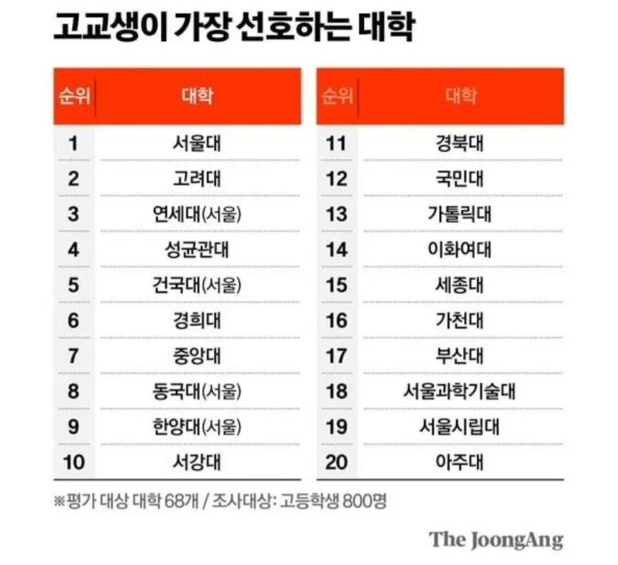 고등학생이 선호하는 대학 순위