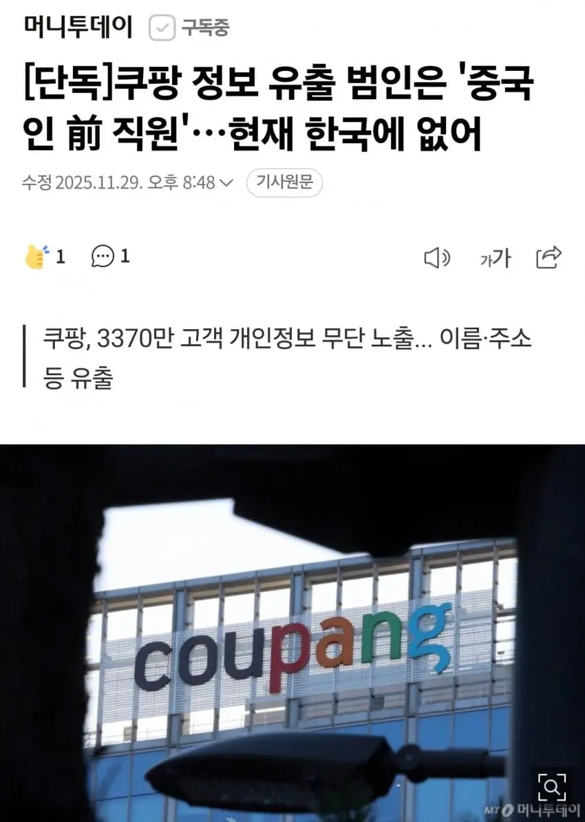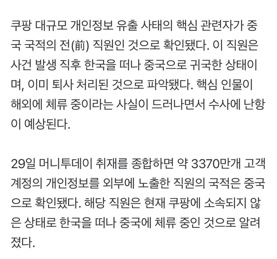 쿠팡 3370만개 정보 유출 직원은 '중국인'...이미 퇴사, 한국 떠났다