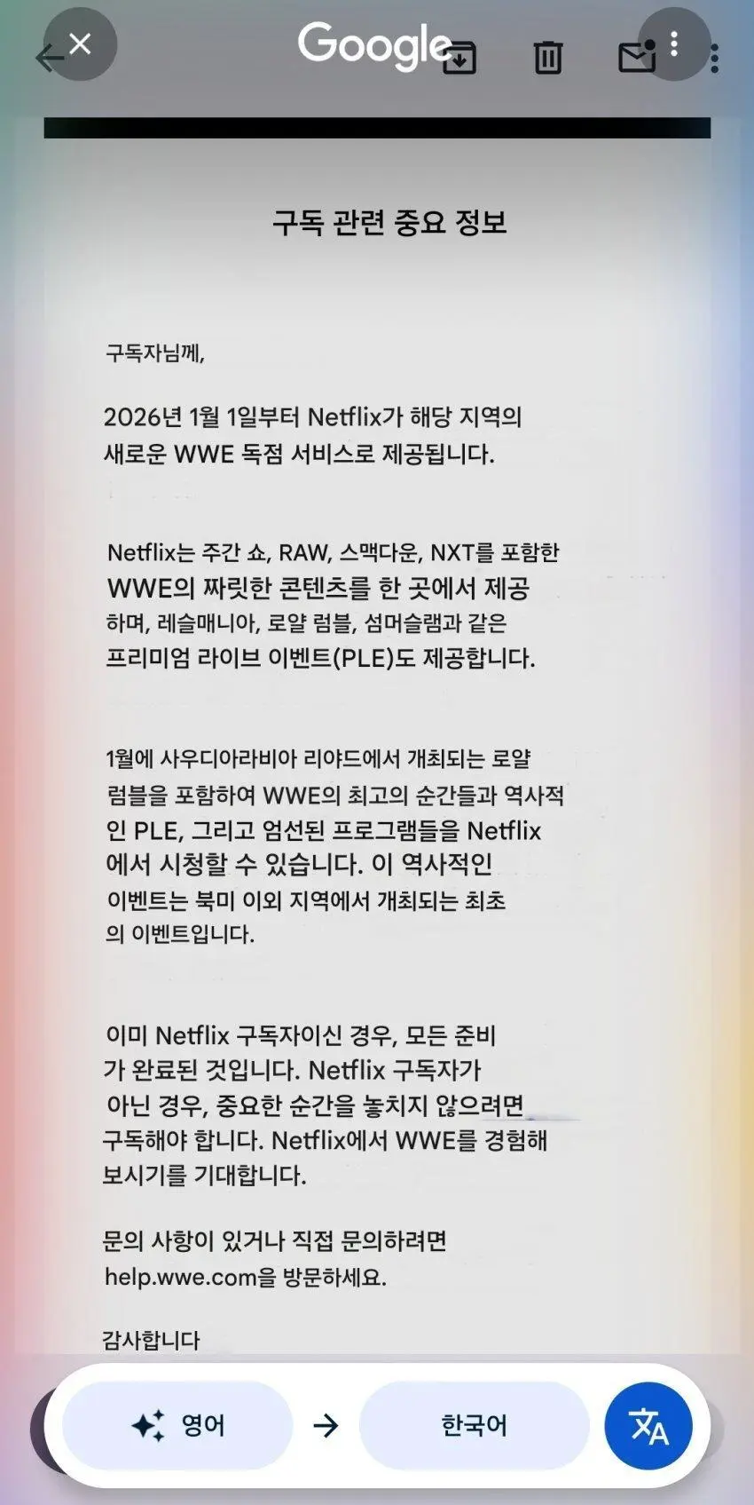 넷플릭스, 2026년 1월 1일부터 WWE 한국 송출 시작.