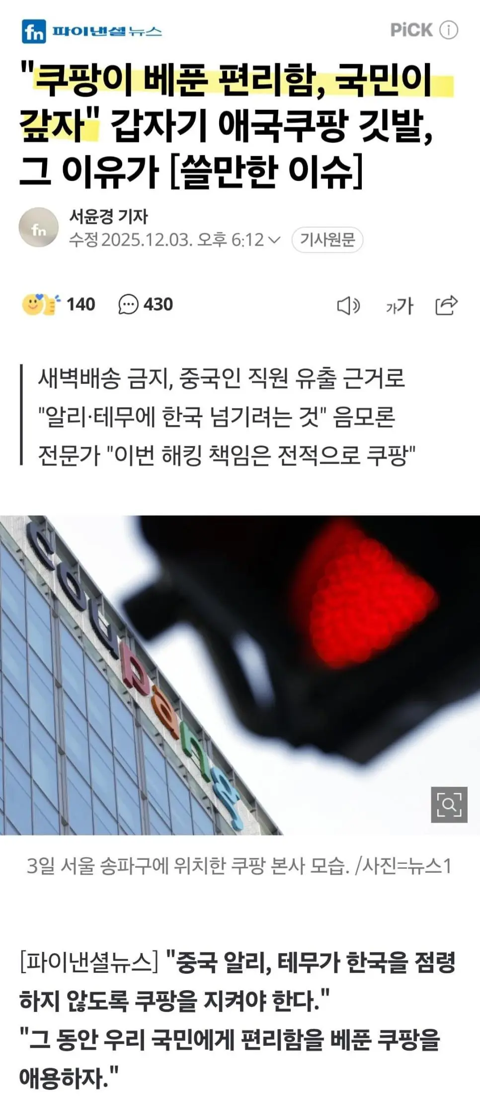 "쿠팡이 베푼 편리함, 국민이 갚자" 갑자기 애국쿠팡 깃발, 그 이유가 [쓸만한 이슈]
