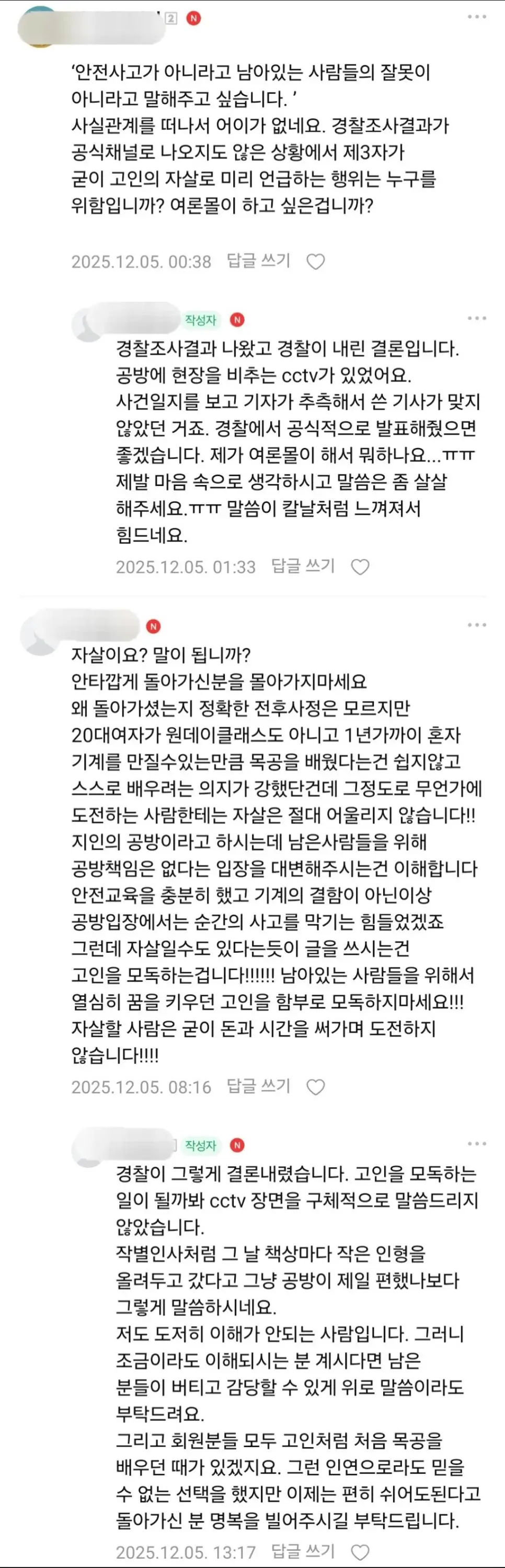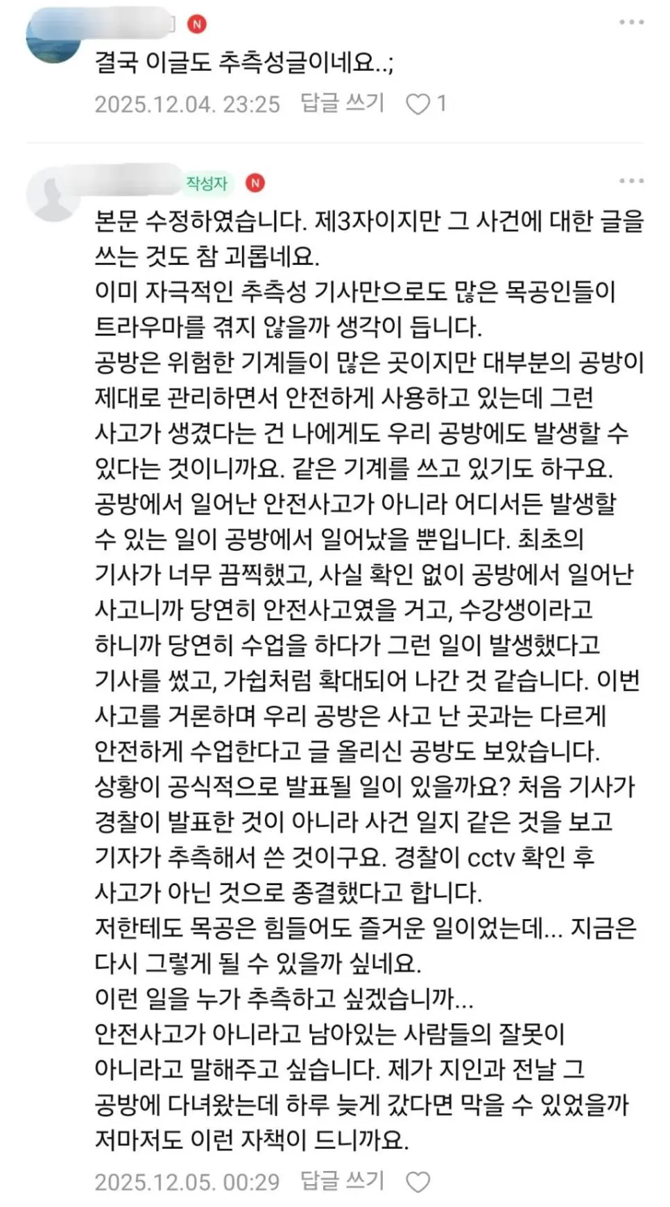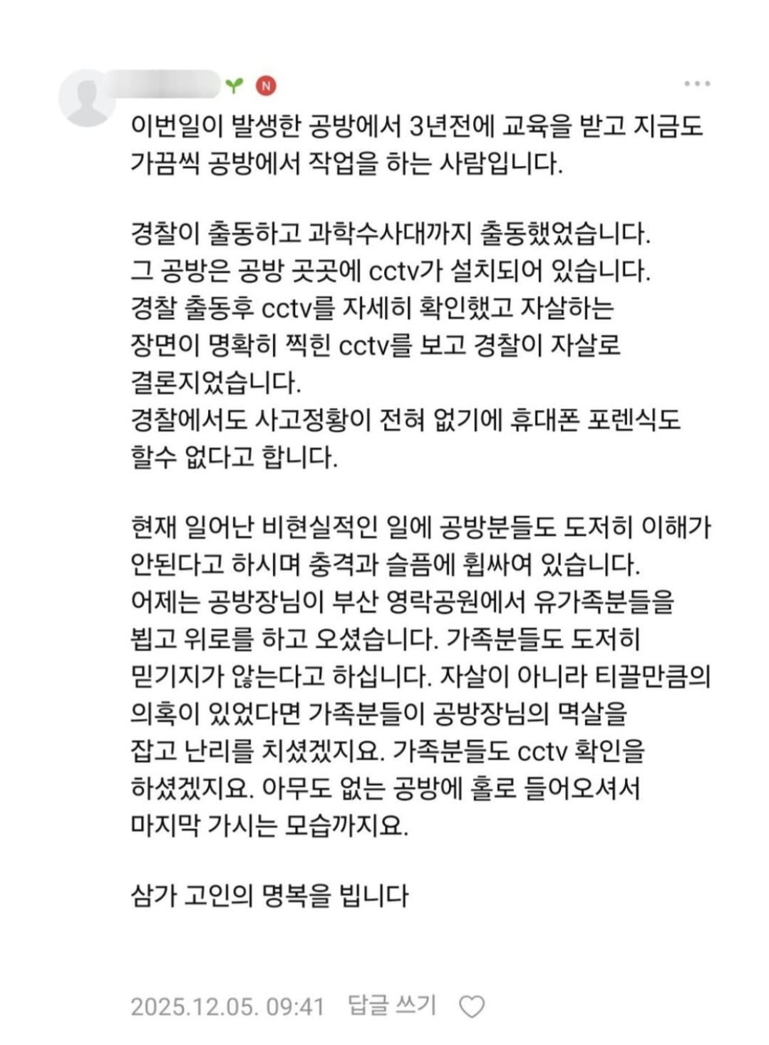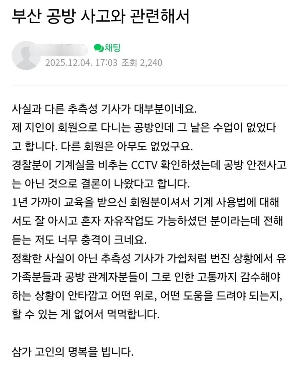 부산 공방 사망사고 관련해서 네이버 공방 카페에 올라온 글