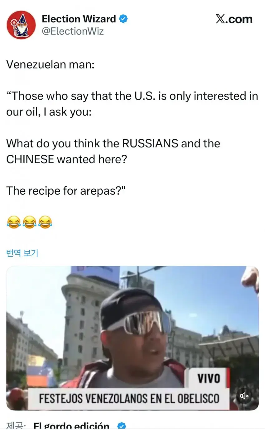 베네수엘라 국민 : 그럼 중국이랑 러시아는 뭐 여기 요리 레시피라도 얻으려고 기웃댄 줄 아쇼?