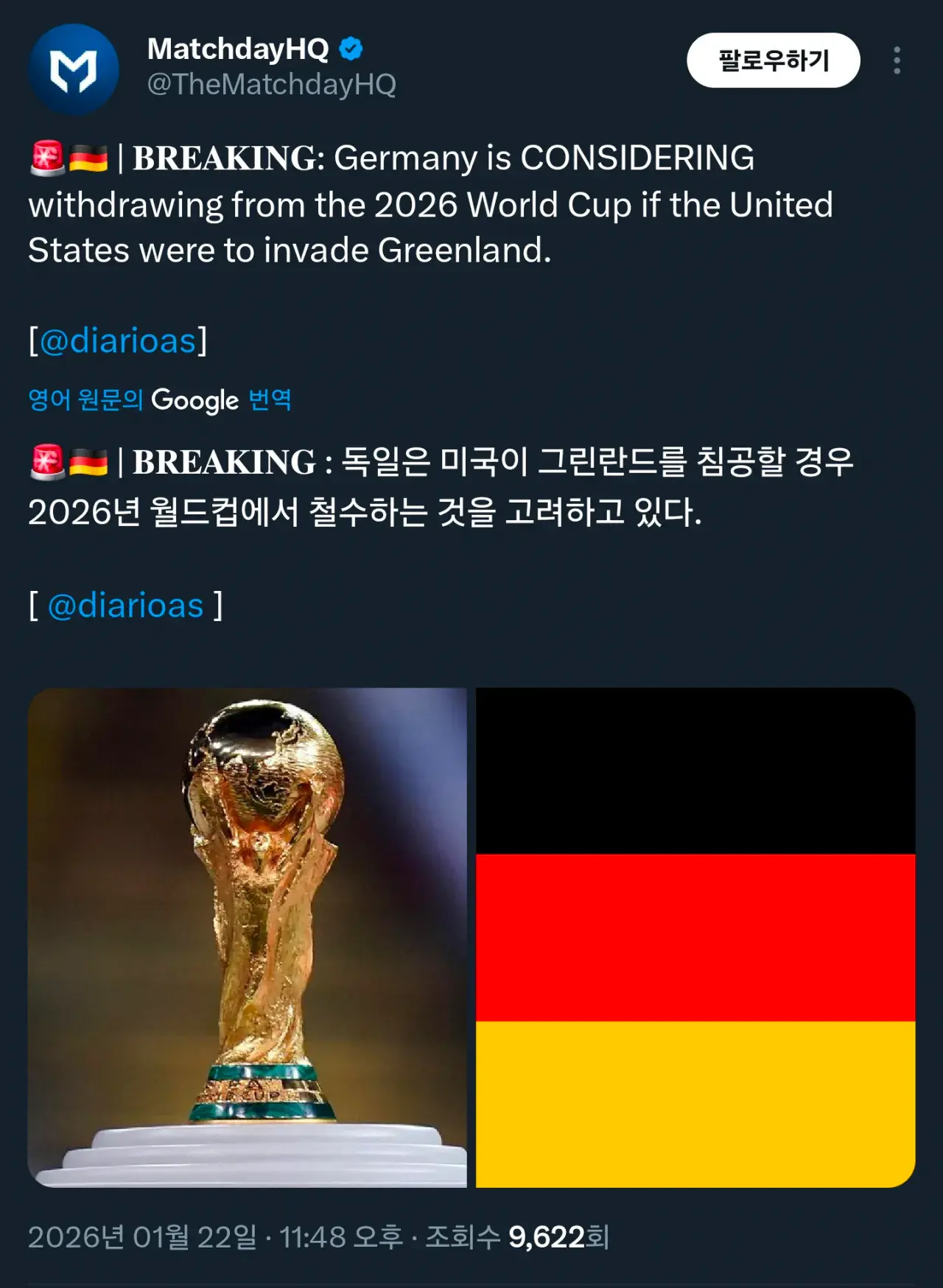 독일은 그린란드 사태로 2026 월드컵 불참 고려중