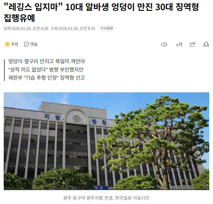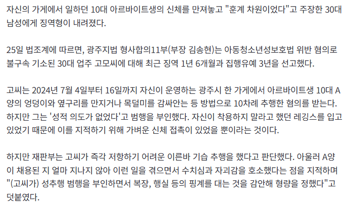 "레깅스 입지마" 10대 알바생 엉덩이 만진 30대 징역형 집행유예