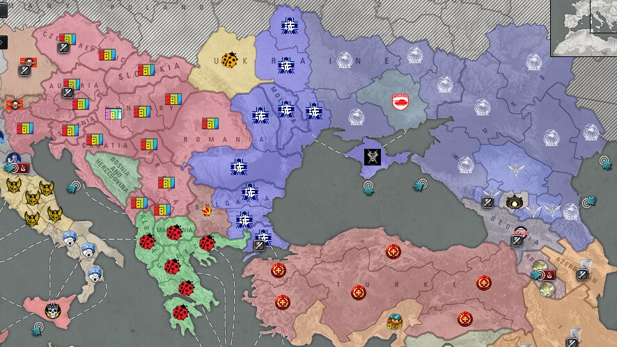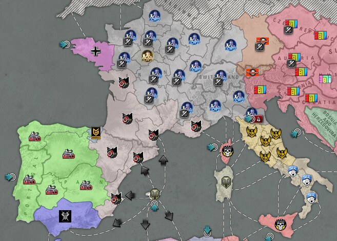 이 외에도 INSKY가 GLORY가 차지한 지역인 코르시카에 상륙하면서 DCBAR는 많은 양의 동시전투를 치뤄야 하는 상황에 놓였습니다. 아마 이 문제를 접경지역에 내란을 발생시키는 방식으로 동시전투를 줄여나갈 것으로 보입니다.