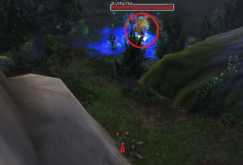 빨간색 원 안의 증오갈퀴 전사 두 마리는 링크몹이고, 전사형 몹이기 때문에 그냥 풀링해서 당겨 잡으면 아무 문제가 없습니다. 전사 두마리를 잡은 후에 뒤에 검은 원 안에 있는 증오갈퀴 사냥꾼을 최대한 멀리 풀하고 뒷걸음질을 해서 앞으로 쭉 다가오게 만든 후에 잡습니다.