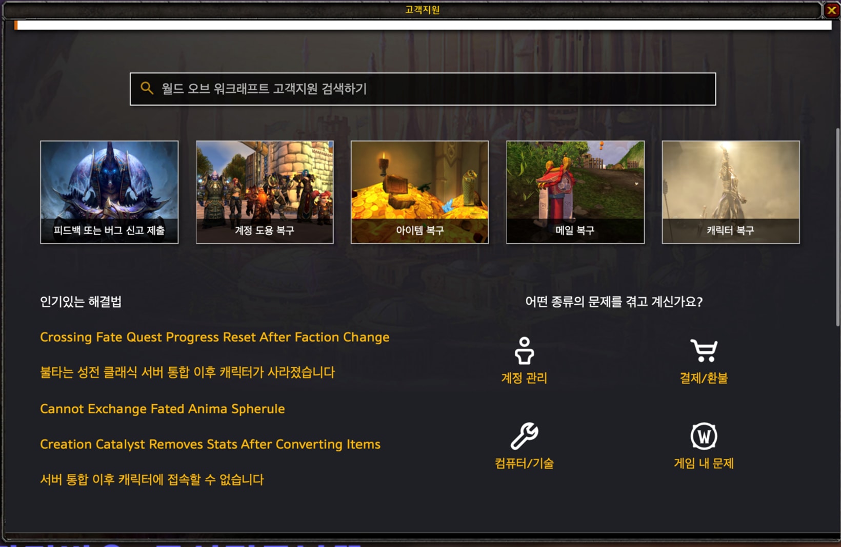 게임 내 고객지원 항목이 그 어느 때보다 깔끔하게 변신했습니다. 이제 수천 개의 게시글을 검색할 수 있으며 굳이 GM을 기다릴 필요 없이 아이템 복구, 캐릭터 복구, 캐릭터 고립 서비스 같은 훌륭한 자체 해결 도구를 사용하실 수 있습니다. 더불어 페이지 상단에 있는 알려진 문제, 긴급 공지, 셀프서비스 옵션을 통해 다채로운 정보를 손쉽게 확인할 수도 있습니다. 인기 게시글을 보고 본인의 문제를 빠르게 파악하는 것 또한 가능하며, 해결법을 파악해 원활한 노스렌드 여정을 즐길 수 있습니다.