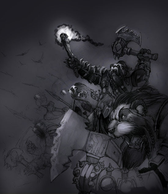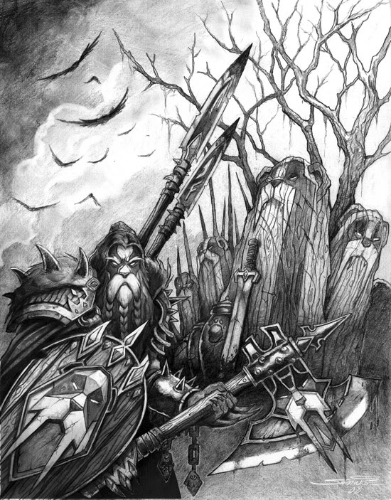 크리스 멧젠의 그림. 펄볼그, 와일드해머 드워프, 노움과 함께 있는 판다렌.