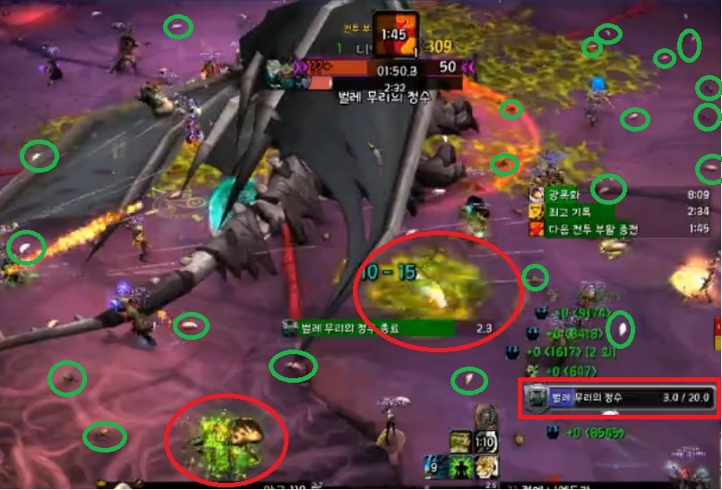 그럼 이 커진 벌레들이(빨간동그라미) [타락 폭발] 이라는 8m 반경 내 데미지를 줍니다.