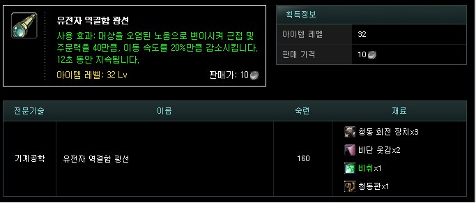 보이는 대로 5초의 쿨을 가지고 있으며 사용시에 왼쪽에 보이는듯이 자신의 케릭터는 무언가를 제작하는듯한
