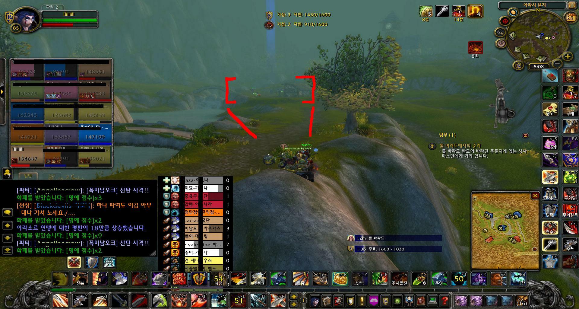 대장과 금광 사이에 위치하면서 3곳을 두루 보며 정찰하고 지원을 해야할지 판단을 합니다. 만약 수비조보다 공격하는 호드의 인원이 많다면 바로 지원 후에 정리가 되는 듯하면