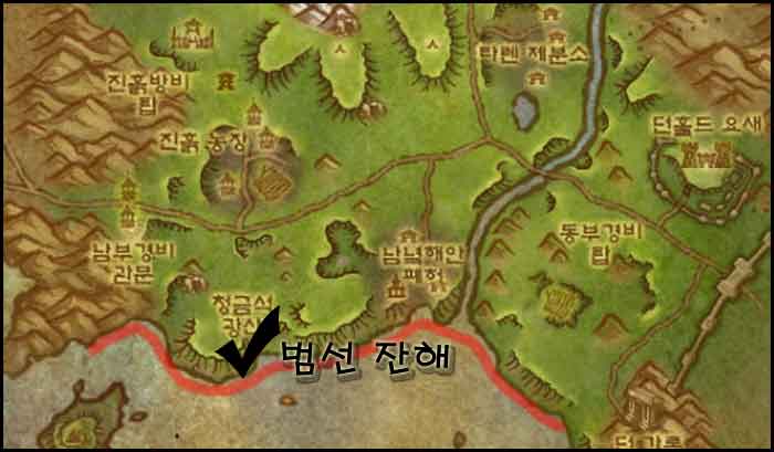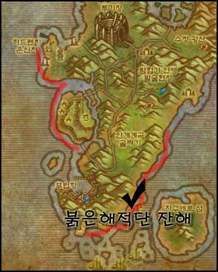 붉은 해적단 잔해(가시덤불 곶) -> 물에 젖은 잔해, 표류하는 잔해(동부 역병지대) -> 범선 잔해(언덕마루 구릉지)