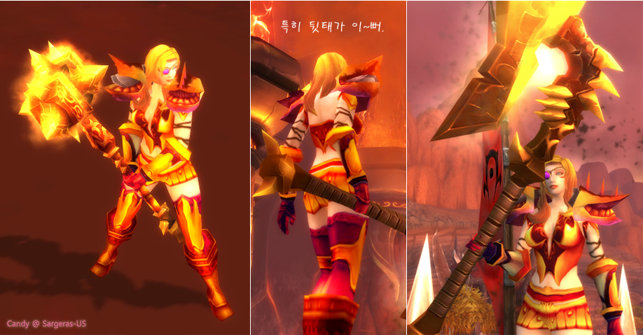 무기 : 양손 둔기는 설퍼라스 - 꺼져버린 손, 도끼는 영혼 가로날도끼, 도검은 검투사의 대검이 잘 어울려요!- 설퍼는 잘 아시다시피 불땅 라그 드랍, 가로날도끼는 검사 4넴 테론 고어핀드, 검투사의 대검은 52번 구역에서 명점 1500에 구하실 수 있어요.