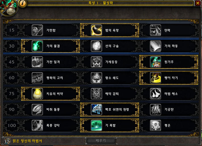 특성은 위와 같이 사용하였고, 딜사이클에 기의 물결과 원기주가 포함되어 있습니다. 100레벨 기 폭발 이외 다른 것 선택할 경우 자동으로 후려차기를 가이드하며 그 외 액티브 스킬을 따로 사용하시면 됩니다.