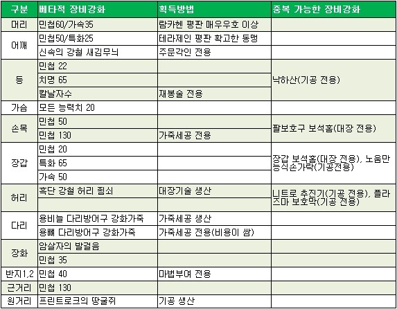 전문기술들과 평판을 통해 아이템의 능력치를 강화시킬 수 있습니다. 아래의 표에서 자신이 원하는 장비강화를 선택하면 됩니다. 베타적 장비강화에 포함되는 것들은 서로 중복할 수 없는 것들입니다. 가령 등에 민첩 22를 발랐다면 치명타 65는 바를 수 없습니다.