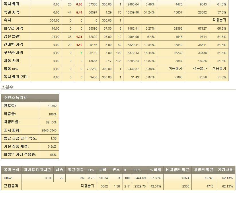 위 자료에서의 스킬 사용 내역 및 펫 DPS 내역 (야생의 사냥 버프 적용율 66%)