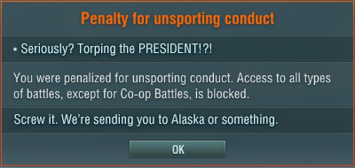 당신은 비신사적행위로 인해 제재를 받았습니다. 협동을 제외한 모든 종류의 전투가 불가능합니다.
