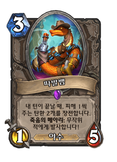 | 효과 | 내 턴이 끝날 때, 피해 1씩 주는 탄환 2개를 장전합니다. 죽음의 메아리: 무작위 적에게 발사합니다! | ||