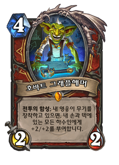 | 효과 | 전투의 함성: 내 영웅이 무기를 장착하고 있으면, 내 손과 덱에 있는 모든 하수인에게 +2/+2를 부여합니다. | ||