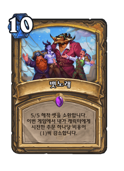 5/5 해적 셋을 소환합니다. 이번 게임에서 내가 캐릭터에게 시전한 주문 하나당 비용이 (1)씩 감소합니다.
