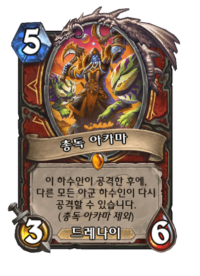 | 효과 | 이 하수인이 공격한 후에, 다른 모든 아군 하수인이 다시 공격할 수 있습니다. (총독 아카마 제외) | ||