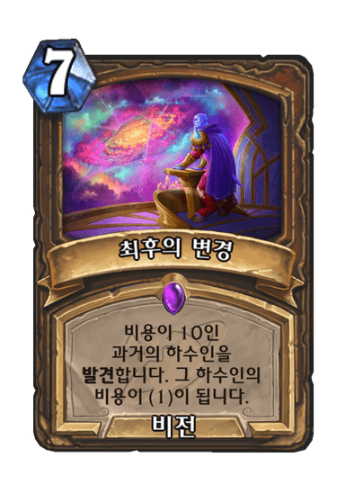 | 효과 | 비용이 10인 과거의 하수인을 발견합니다. 그 하수인의 비용이 (1)이 됩니다. | ||
