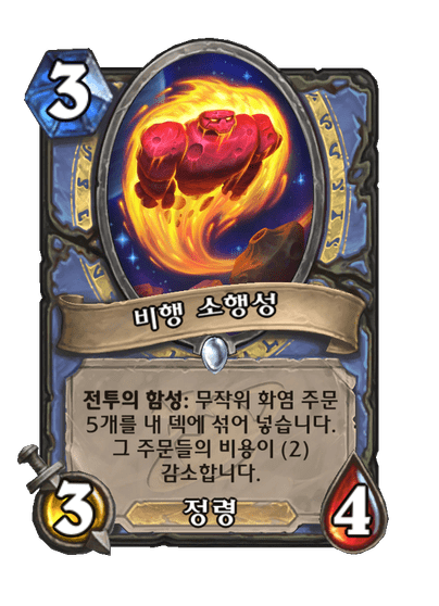 전투의 함성: 무작위 화염 주문 5개를 내 덱에 섞어 넣습니다. 그 주문들의 비용이 (2) 감소합니다.