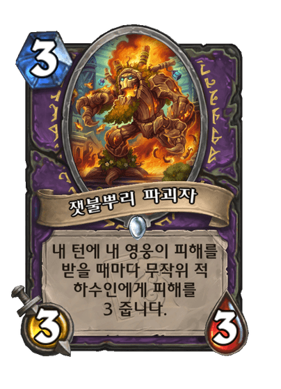 내 턴에 내 영웅이 피해를 받을 때마다 무작위 적 하수인에게 피해를 3 줍니다.