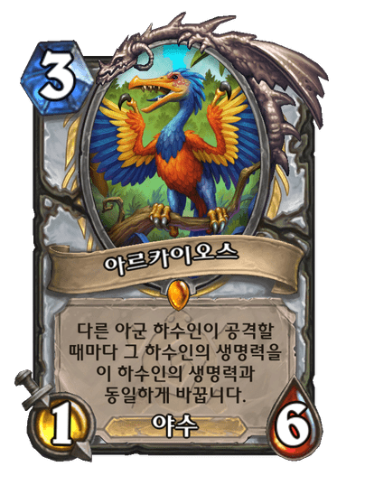 다른 아군 하수인이 공격할 때마다 그 하수인의 생명력을 이 하수인의 생명력과 동일하게 바꿉니다.