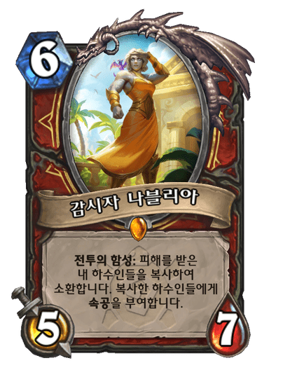 | 효과 | 전투의 함성: 피해를 받은 내 하수인들을 복사하여 소환합니다. 복사한 하수인들에게 속공을 부여합니다. | ||