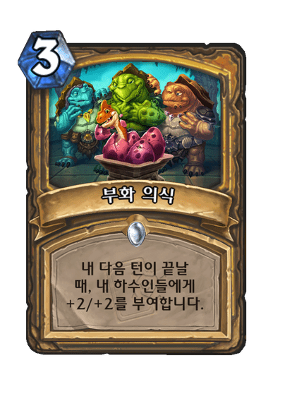 내 다음 턴이 끝날 때, 내 하수인들에게 +2/+2를 부여합니다.
