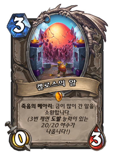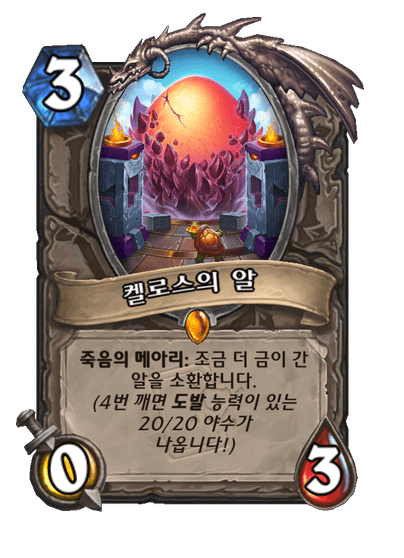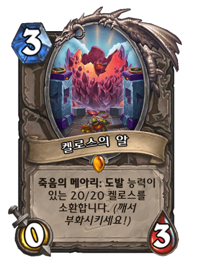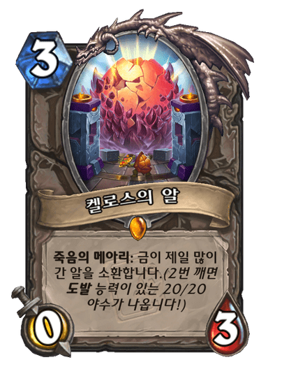 | 효과 | 죽음의 메아리: 조금 금이 간 알을 소환합니다. (5번 깨면 도발 능력이 있는 20/20 야수가 나옵니다!) | ||