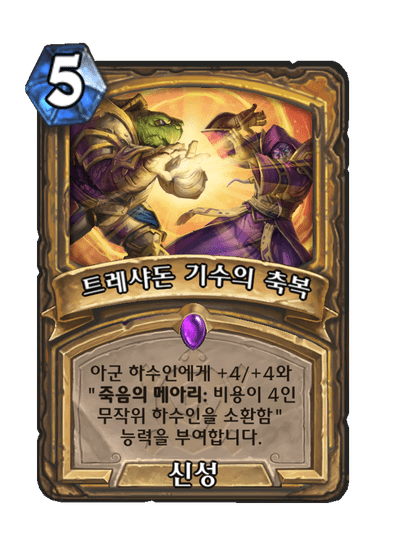 아군 하수인에게 +4/+4와 "죽음의 메아리: 비용이 4인 무작위 하수인을 소환함" 능력을 부여합니다.