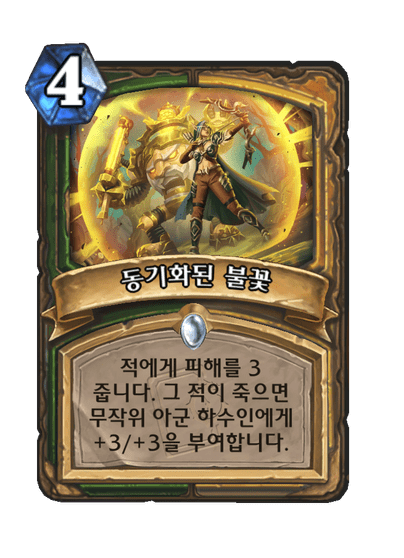 적에게 피해를 3 줍니다. 그 적이 죽으면 무작위 아군 하수인에게 +3/+3을 부여합니다.