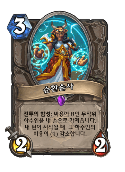 전투의 함성: 비용이 8인 무작위 하수인을 내 손으로 가져옵니다. 내 턴이 시작될 때, 그 하수인의 비용이 (1) 감소합니다.