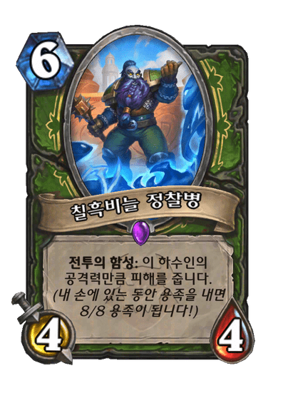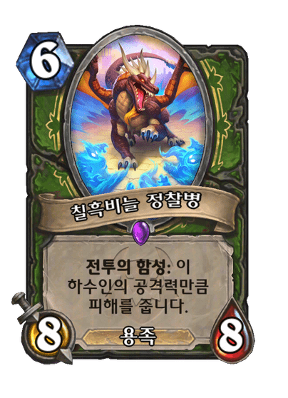 전투의 함성: 이 하수인의 공격력만큼 피해를 줍니다. (내 손에 있는 동안 용족을 내면 8/8 용족이 됩니다!)