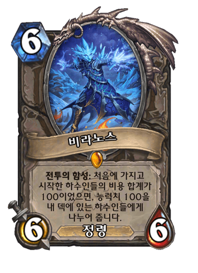 | 효과 | 전투의 함성: 처음에 가지고 시작한 하수인들의 비용 합계가 100이었으면, 능력치 100을 내 덱에 있는 하수인들에게 나누어 줍니다. | ||