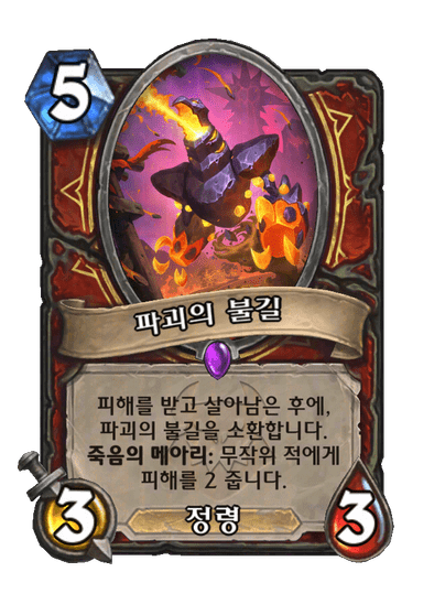 피해를 받고 살아남은 후에, 파괴의 불길을 소환합니다. 죽음의 메아리: 무작위 적에게 피해를 2 줍니다.