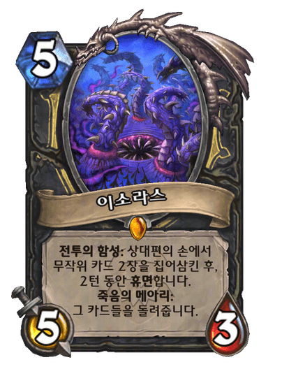 전투의 함성: 상대편의 손에서 무작위 카드 2장을 집어삼킨 후, 2턴 동안 휴면합니다. 죽음의 메아리: 그 카드들을 돌려줍니다.