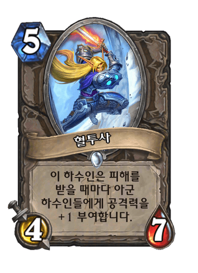 이 하수인은 피해를 받을 때마다 아군 하수인들에게 공격력을 +1 부여합니다.