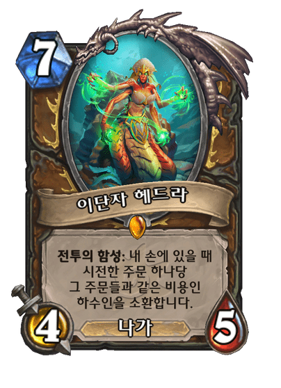 | 효과 | 전투의 함성: 내 손에 있을 때 시전한 주문 하나당 그 주문들과 같은 비용인 하수인을 소환합니다. | ||