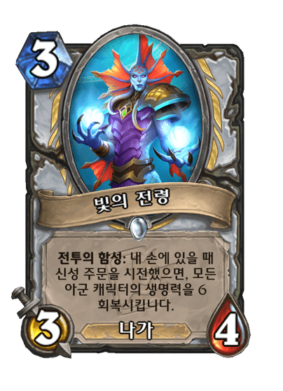 전투의 함성: 내 손에 있을 때 신성 주문을 시전했으면, 모든 아군 캐릭터의 생명력을 6 회복시킵니다.