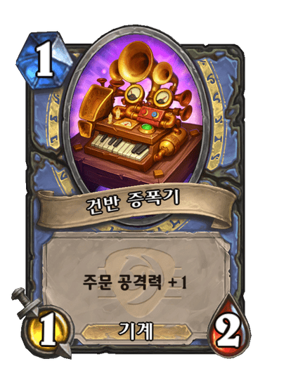 전투의 함성: 내 전장에 다른 하수인이 없으면, 주문 공격력 +1이 있는 1/2 증폭기를 둘 소환합니다.